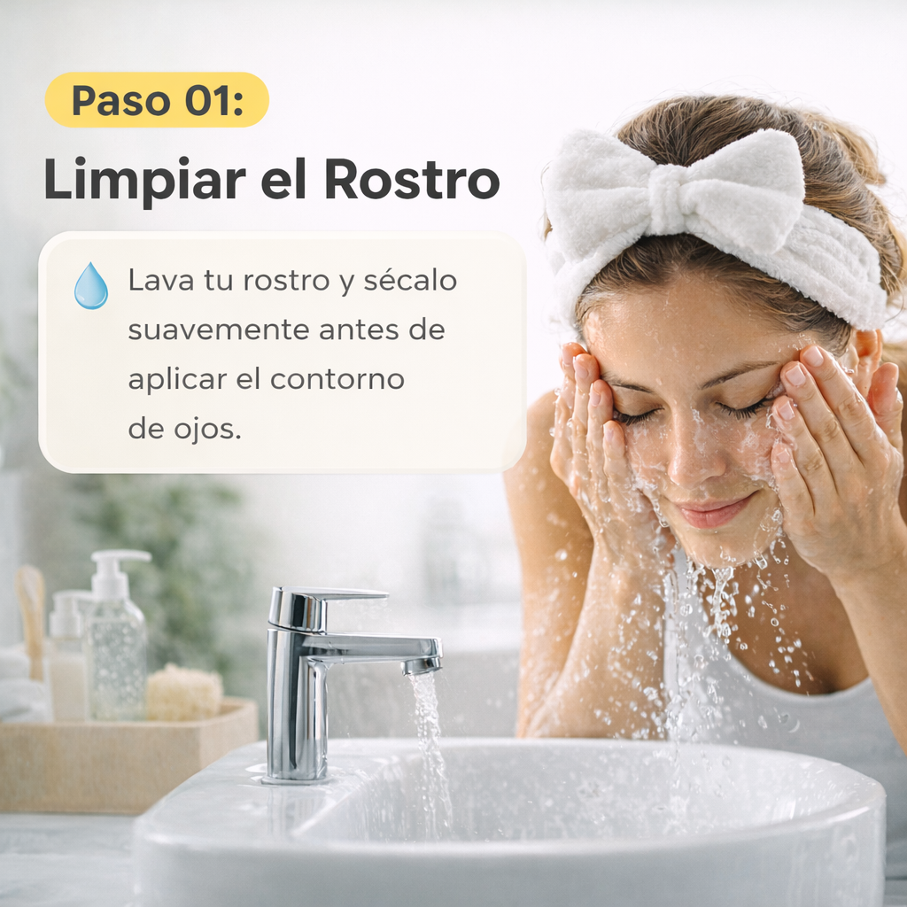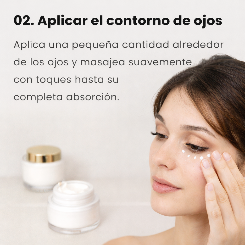 Aplica una pequeña cantidad en el contorno de ojos limpio y seco. Da suaves toquecitos con la yema del dedo anular, desde el lagrimal hacia el exterior, hasta su completa absorción. Úsalo mañana y noche.